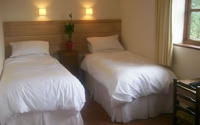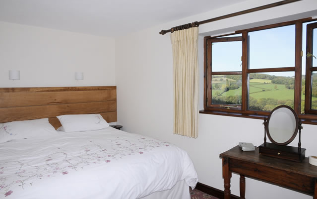 The bedroom looks out over a good-sized private lawn, to the rolling hills and the village of Itton. It is tastefully furnished with bedside tables, wardrobe, a dressing-table and wall-mounted reading lights above the beds. Arranged to suit 2 people in twin 3ft beds or a super-king double option if preferred. Beds are made ready with freshly - laundered quality linen, towels and extra bedding for the colder months is always available.