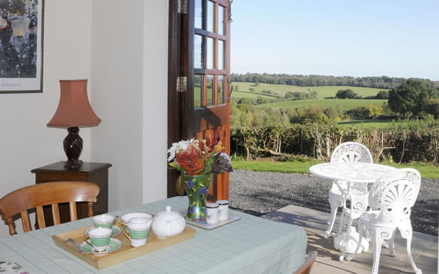 The lounge and dining areas are bright, airy and comfortably furnished, with patio doors looking out over a private paved area with patio furniture, and panoramic countryside views beyond. The lounge has seating for 4 with a comfy sofa and armchair, flat screen TV, coffee table and table lamp, along with a small selection of books, games and DVDs.